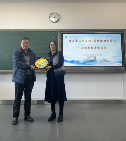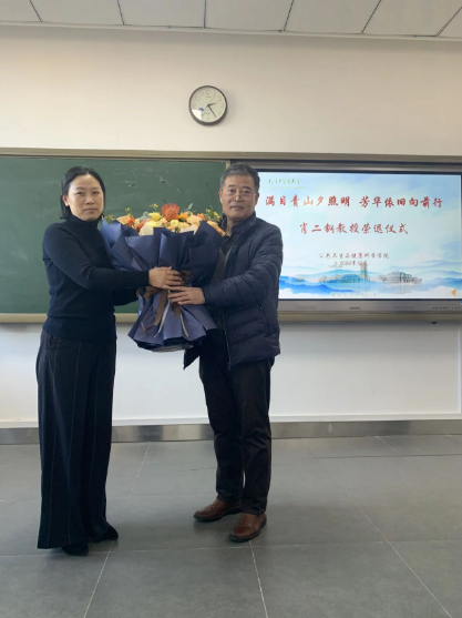学院党委书记王芬为肖老师赠送了荣退纪念品,党委统战部副部长李娜代表统战部为肖老师赠送了鲜花。肖二钢老师发表了感言,他对职能部门领导、学院领导和学院老师们多年来对他的支持和关心表示感谢。他回首了自己在学校多年的执教生涯,作为学校和学院蒸蒸日上发展的亲历者和参与者,他感到欣慰和自豪,即将离开学校,开启退休后的生活,他对学校有着依依不舍的眷恋和深情,对学校和学院未来的发展有着美好期许和祝愿,对自己退休后的生活有着美好的期待。