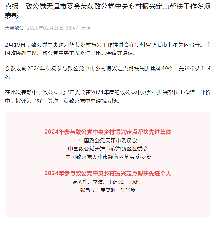 2月19日,致公党中央助力毕节乡村振兴工作推进会在贵州省毕节市七星关区召开,会议表彰了2024年积极参与致公党中央乡村振兴定点帮扶先进集体和先进个人。我校致公党党员高秀梅、罗笑琳荣获2024年参与致公党中央乡村振兴定点帮扶先进个人。