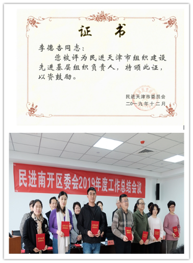 2019年12月10日,民进天津市基层组织建设成果展暨总结表彰大会在天津市政协俱乐部召开,天津中医药大学支部组织建设成果显著,受到民进天津市委员会的肯定与表扬,支部主委李德杏同志获“先进基层组织负责人”荣誉称号。