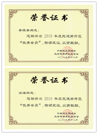 民进会员代表李德杏、汪涛获民进南开区“优秀会员”荣誉称号