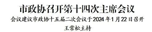 会议建议,中国人民政治协商会议天津市第十五届委员会第二次会议于2024年1月22日召开。