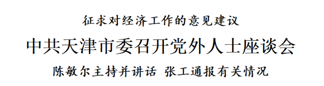 座谈会上,民革市委会主委齐成喜、民盟市委会主委李剑萍、民建市委会专职副主委张荃、民进市委会主委张金英、农工党市委会专职副主委于春水、致公党市委会主委高秀梅、九三学社市委会主委张凤宝、台盟市委会主委蔡欣、市工商联主席娄杰和无党派人士代表刘晨阳发言。大家一致赞同中共天津市委对当前经济形势的分析判断和明年经济工作的谋划考虑,并围绕推动京津冀协同发展、高标准建设天开高教科创园等创新平台、进一步盘活存量资源资产、因地制宜发展新质生产力、大力发展循环经济、持续优化营商环境、促进民营经济健康发展,加快培育外贸增长新动能、数智赋能城市治理等方面提出意见建议。